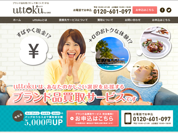 「uttoku by GREE」は、「売って得する」「お客さまのかしこい選択を応援する」をコンセプトに使わなくなったブランド品を現金または提携企業の各種サービスに好感できるブランド品買取サービス。通常のブランド品買取サービスでは買い取りは現金のみだが、同サービスは現金に加えリユース業界初、現金以外の他社クーポンへも好感できる仕組みを導入した。これにより、ポイントやクーポンへの交換、チャリティーへの募金が可能だ。例えば現金なら1万円の査定額がポイントやクーポンを利用すると1万5000円相当になるなど、査定額の最大50%が上乗せされたポイントやクーポンと交換することもできる。