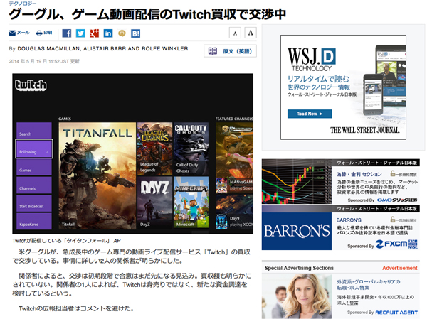Google傘下のYouTubeが、ゲーム専門の動画ライブ配信サービス「Twitch」買収に向けて交渉中だとWALL STREET JOURNALが報じている。Twitchの広報担当者はコメントを避けたという。