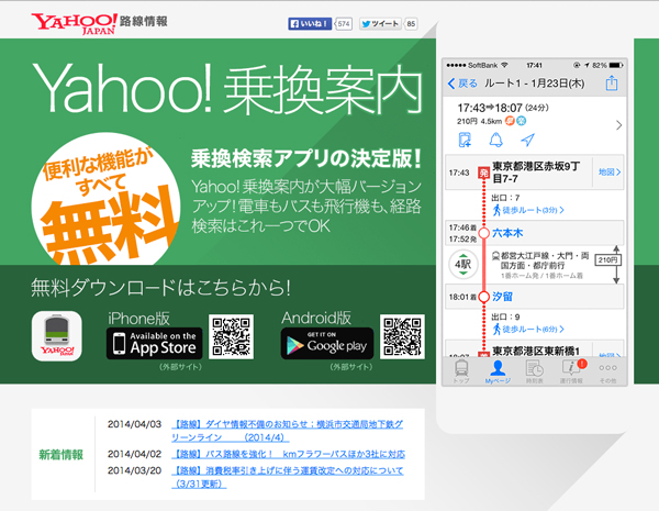 ヤフー株式会社は、スマートフォンアプリ「Yahoo!乗換案内」Android版およびiOS版の累計ダウンロード数が2014年5月18日(日)に1000万を突破したと発表した。