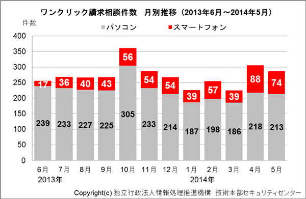 2014年4月・5月にかけてIPAに寄せられたワンクリック請求の相談件数は合計593件で、そのうちスマートフォンでのワンクリック請求に関する相談件数は合計162件と3割を占めている。これはスマートフォンの普及によって子どもから大人まで世代に関係なく気軽にインターネットを閲覧できる環境が整ってきたためと考えられるという。