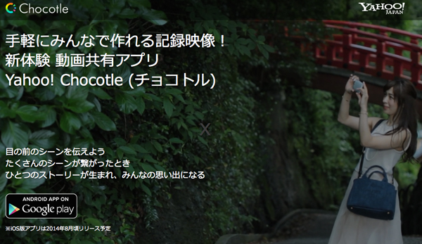 ヤフー株式会社は、撮影・共有・閲覧が簡単に行えるショート動画共有アプリ「Yahoo! Chocotle(チョコトル)」をAndroid向けに提供開始した。iOS版は2014年8月頃にリリース予定となっている。