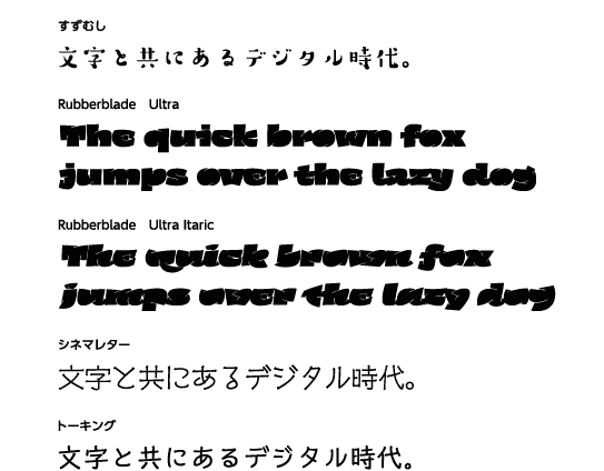 「すずむし」はタイプデザインコンペティション2012の和文部門・明石賞を受賞した書体で、コロコロとした柔らかい仮名に、一見アンバランスでゆるやかな印象でありながら整理された骨格・エレメントをもつ漢字が組み合わされた、かわいらしいデザイン書体。また、欧文部門・明石賞を受賞した「Rubberblade」は線画の強さ、太さを全面に押し出したデザインで、200以上の組み合わせを持つ欧文合字などのOpenType機能を利用すれば、躍動感に満ちた文字組みを実現してくれる。