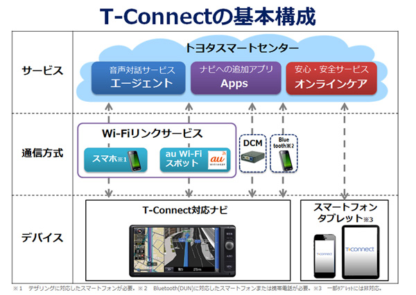 T-ConnectナビにはWi-Fiリンク機能が標準装備されており、スマートフォンや「au Wi-Fiスポット」を介してトヨタスマートセンターに接続して各種サービスを享受できる。また、従来の車載通信機DCMもオプションで装着できる。