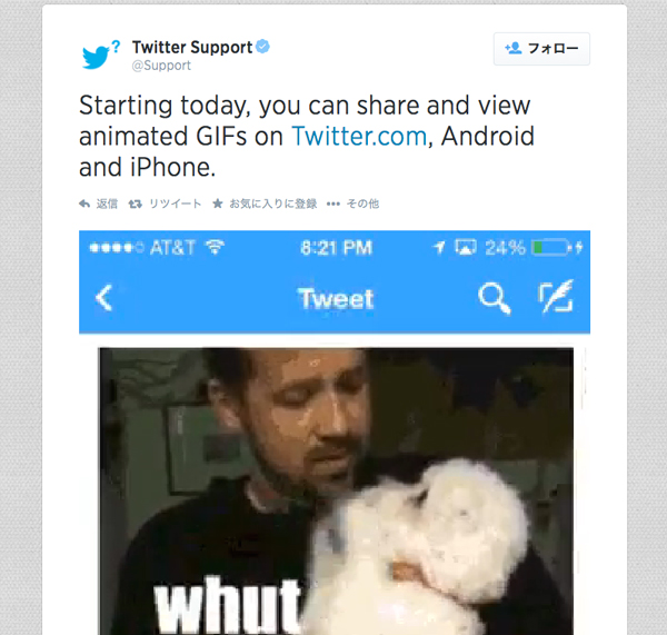 公式アカウントでの発表ツイートにはGIFアニメが添えられており、「Twitter now supports GIFs!?!?(TwitterがGIFアニメをサポートしたって?)」「GIFs got me like(GIFだとこうなります)」という言葉とともに白い犬が元気に動くGIFアニメが表示される。また、ツイートのGIFアニメは自動再生はされずツイートをクリックするか、再生ボタンを押す必要がある。