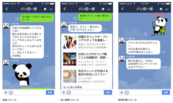 「パン田一郎」は自然言語処理技術により、ユーザーと会話しながらバイト情報、バイトの際に役立つ情報を得ることが可能だ。言葉を投げかけると内容に応じたメッセージを返したり、仕事の悩みや相談をもちかけると仕事にまつわる名言を返す。また、バイトのエリアや職種などを話かけると条件に合った求人を受取れるほか、バイトの開始と終了を伝えると給与を計算いて教えてくれるなどのサポートもしてくれる。