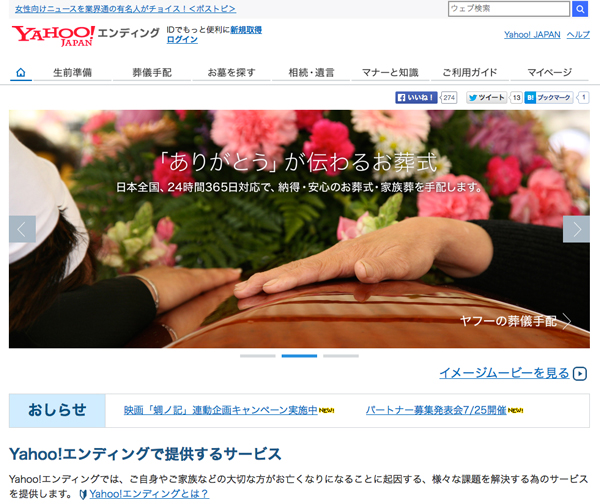 ヤフー株式会社は、株式会社鎌倉新書の協力のもと人生の最期(ライフエンディング)に関連する総合ポータルサービス「Yahoo!エンディング」の提供を開始した。