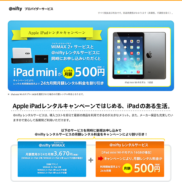 今回、同時申し込みに対応した対象製品とレンタル料金は、iPad Air Wi-Fi 16GBが月額2600円(税抜)、iPad mini Retine Wi-Fi 16GBが月額2170円(税抜)、iPad mini Wi-Fi 16GBが月額1740円(税抜)で、別途に初期登録費用の2000円(税抜)が必要。最低利用期間は機器到着翌月から24カ月間、レンタル提供期間は機器到着翌月から48カ月間(最低利用期間満了後は1カ月ごとに自動延長)となっており、利用開始月や最低利用期間中にサービスを解除した場合には、契約解除料が必要とされる。対象となる「@nifty WiMAX」サービスのプランは、「@nifty WiMAX 2+」のWiMAX 2+ Flat 2年/Flat 2年 auスマホ割/Flat 4年 auスマホ割引。各プランの料金の詳細については、サービスページ(URL:http://setsuzoku.nifty.com/wimax/)での確認が可能だ。