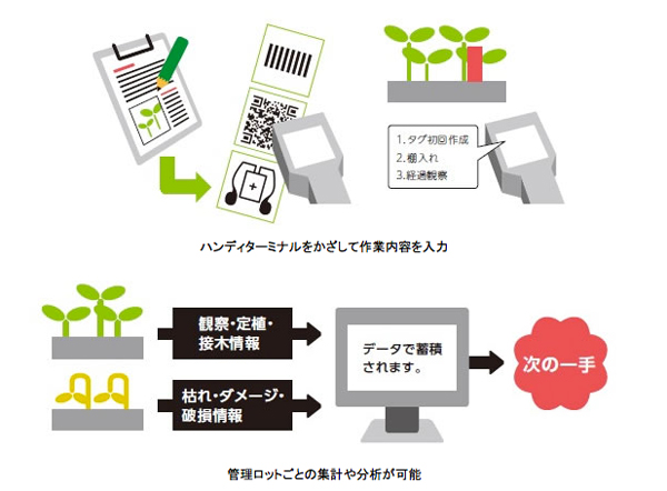 同ソリューションは、ハンディターミナルを活用し栽培現場での作業履歴収集とデータ管理を容易にするサービス。多品種少量生産や、栽培植物をロットごとに管理する植物工場・施設園芸での生産管理に適している。作業者は管理単位のロットに挿してあるRFIDや二次元コード付きタグにハンディターミナルをかざし、固体を識別しながら作業実績を入力することが可能だ。これにより、生育途中で栽培場所が変わる植物工場においても一貫した作業履歴の管理が容易になるとしている。