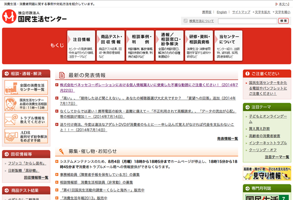 国民生活センターは、株式会社ベネッセコーポレーションにおける個人情報漏洩に関連し「あなたの情報が流出していないか確認している」「流出した名簿にあなたの名前がある。このままでは口座凍結される」といった不審な勧誘に関する相談が寄せられ始めているとして、注意喚起している。