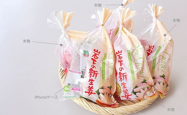 同製品は、食品サンプルの新生姜をまるごと1本乗せたiPhoneケースと、新生姜の食品サンプルがついたイヤホンジャックアクセをセットにしたもので、パッケージも本物を使用。その見栄えはスーパーなどで販売している本物の商品を見間違うほどのクオリティだという。