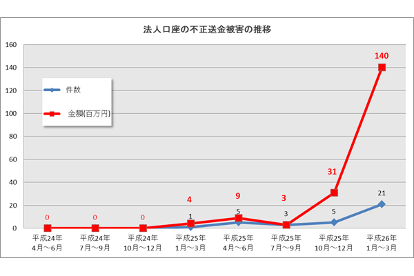 独立行政法人情報処理推進機構(IPA)は、インターネットバンキングにおける不正送金被害が増加傾向にあり、全国銀行協会によるアンケート結果を見ると、過去2年間の法人口座の不正送金被害が2014年に急増しているとして、注意を呼びかける文書を発表した。