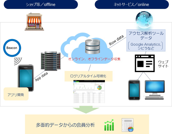 同サービスはiBeaconから生成されるオフラインログデータと、GoogleAnalyticsなどのWebアクセス解析データをビッグデータプラットフォームで集中管理し、モニタリングや会員分析を提供するサービス。WebやSNSなどのオンラインデータ、実店舗やイベントなどのリアルデータを統合・分析して、さまざまな角度から行動分析を行うことにより、各チャネルや各消費者への最適なアプローチを導き出すことが可能だ。