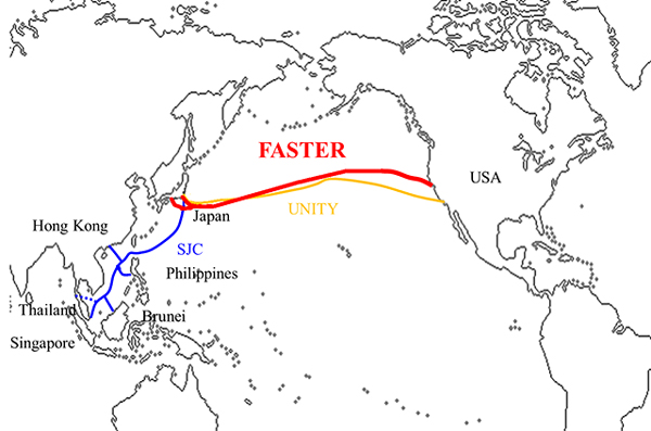 「FASTER」は、日米間を直接結ぶ総延長約9000kmの光海底ケーブル。世界最大規模の初期設計容量60Tbpsを実現するもので、2016年度第1四半期の運用開始を予定している。これにより、スマートフォンやタブレットの浸透、LTE網など高速無線通信の拡充で爆発的に増加している日米間のインターネットトラフィック需要に対応するとしている。