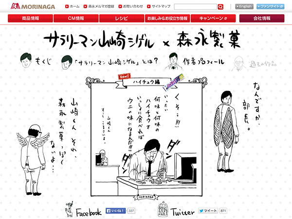 森永製菓株式会社は、一コママンガ「サラリーマン山崎シゲル」とのコラボレーションサイト「サラリーマン山崎シゲル×森永製菓」を公開した。「サラリーマン山崎シゲル」は、お笑い芸人のタナカダファミリア/田中光氏(グレープカンパニー)がインターネット上で発表し、書籍化も果たした作品で、“異常な日常”をシュールに描いていることが特徴。同社リリースでは、この「サラリーマン山崎シゲル」とのコラボレーションは、企業としては初の試みとされている。