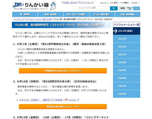 りんかい線を運営する東京臨海高速鉄道株式会社とゆりかもめ線を運営する株式会社ゆりかもめは、東京ビッグサイトにて開催されている「コミックマーケット86」に合わせて電車を増発している。