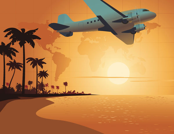 海外旅行を連想させる、飛行機と海のイラスト。旅行関係のご案内などにぴったりと思います。商用利用も可能です。
