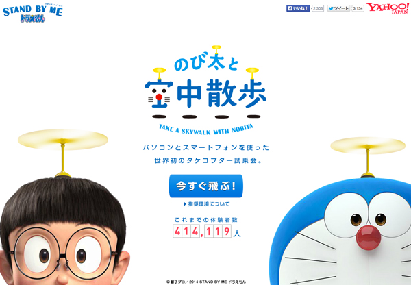 ヤフー株式会社は、ドラえもんのタケコプターをモチーフに東京の空中散歩を楽しめる新感覚アトラクション「ドラえもん『のび太と空中散歩』」を2014年9月4日(木)まで特設サイトにて公開している。
