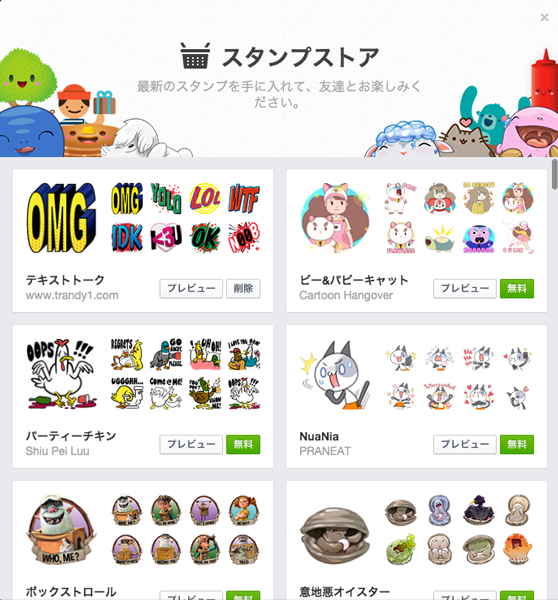 コメント欄でスタンプを使用するには、コメント欄の右端にあるスマイルマークをクリックし、使いたいスタンプをクリックするだけ。また、新機能提供に合わせて新たにスタンプが公開されている。右上のカートマークをクリックするとスタンプストアが表示され、各種スタンプは「プレビュー」で全種類を確認できるほか、「プレビュー」隣の緑のマークをクリックすると無料(または有料)でスタンプを追加できる。
