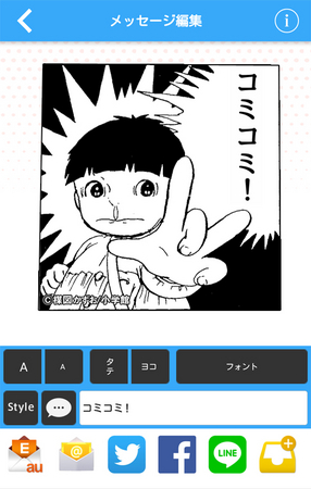 同アプリは、漫画のフキダシにあるセリフを自由に書き換えて送信できるコミュニケーションツール。コマはメールで送れるほか、TwitterやFacebookなどに投稿することもできる。配信予定の作品は「行け! 稲中卓球部」や「まことちゃん」、「寄生獣」、「ちはやふる」、「伝染るんです。」など人気作品を取り揃えている。