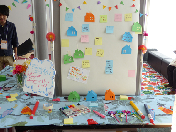 そして最終日の12日は、アンカンファレンス(参加者自身がテーマを出して話し合うカンファレンス)が開催された。関氏によれば、初日は「Connect」、2日目は「Input」、3日目は1日目と2日目の内容を踏まえての「Output」を行う日、ということでこのような構成にしたという。会場には、3日目にディスカッションしたいテーマを募集するコーナーが設けられて、参加者が次々に付箋紙にテーマを書き込んでボードに貼っていった。なお、3日目には、被災地支援を進めるエンジニアのコミュニティ「Hack for Japan」主催の「防災・減災ハッカソン」も併催された。