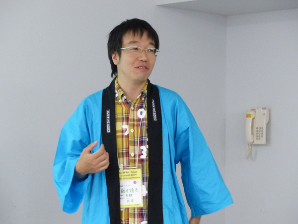 次に登壇したのは、「Code for Aizu(CfA)」の藤井靖史氏(会津大学 リサーチ・アドミニストレーター)。藤井氏は、CfAのロゴが入った法被を着て登場した。「この法被は地元の祭りに参加するために作ったものです。このように、街の人に『ITを使いませんか』と聞くのではなく、自分たちの方から街へ入っていくという姿勢で取り組んでいます」と藤井氏。