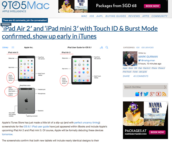 9to5Macの記事によると、「iPad Air 2」および「iPad mini 3」の画像はiTunes Storeの「iBooks」用書籍コンテンツユーザーに向けた「iPad User Guide For iOS 8」ページに掲載された。この画像から、iPad新型モデルの名称が「iPad Air 2」「iPad mini 3」であること、ホームボタンにTouch IDを搭載していることが明らかとなった。また、説明文から連写機能「Burst Mode」も使用可能であることがわかったという。現在はこの画像は削除され、現行のiPadモデルの画像が掲載されている。