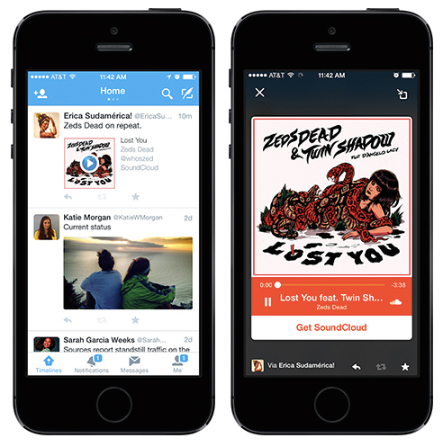 Twitterは、SoundCloud(@SoundCloud)の協力のもと、モバイル向けアプリのタイムライン上で、ワンタップでプレーヤー画面に切り替えて再生することが可能なオーディオカード機能を一部のアーティストやメディアへ試験的に導入したと発表した。