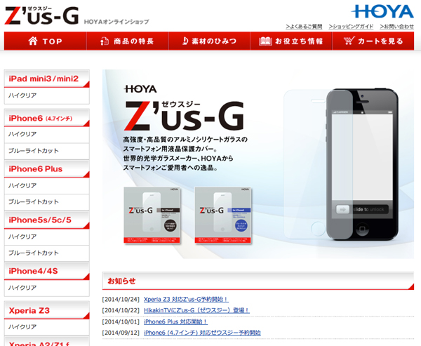 HOYAサービス株式会社は、強化ガラス製液晶保護フィルム「Z'us-G(ゼウスジー)」のiPad mini3対応モデルを発売した。iPad mini2にも対応しており、ハイクリアタイプの価格は4860円(税込)。