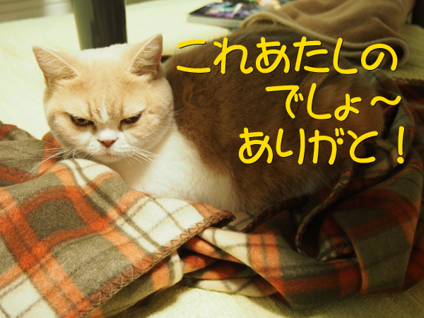 もはや飼い主は猫の奴隷として新品のひざ掛けを差し出すしかないのです……(あきらめ)。