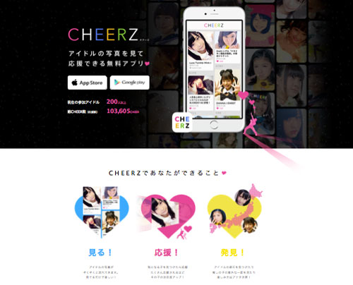 フォッグ株式会社は、30組200人以上のアイドルが投稿した写真に対し、ユーザーが「CHEER」ボタンを押すことでアイドルを応援できる、ユーザー参加型アイドル応援アプリ「CHEERZ」を公開した。iOS/Androidに対応している。