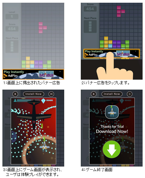 同ソリューションは、ユーザーがスマートフォンアプリやサイト上の広告をタップすると、広告対象であるアプリをそのサイト上で1分間無料体験プレイすることができるソリューション。これによって、ユーザーはダウンロードすることなくアプリを疑似的にプレイすることが可能となり、これまでより正確にアプリの内容を理解して、ダウンロードの要否を検討することが可能となる。