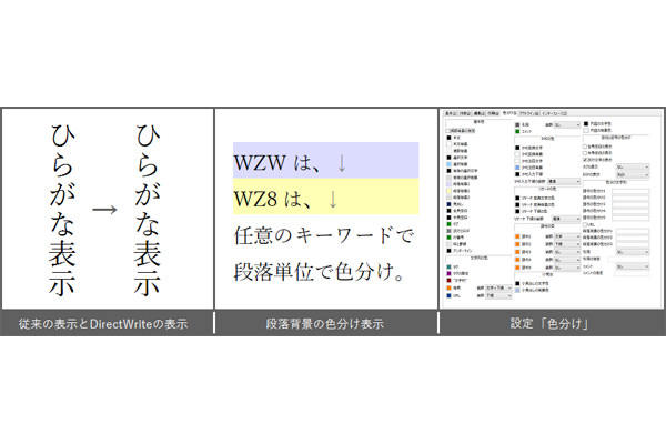 本バージョンでは、WindowsのDirectWriteで文章を美しく表示できるようになった(Windows 8.1/8/7のみ)ほか、DirectWriteが適用されない文字も、クリアビューで美しく表示可能となった。また、キーワードや会話文、冒頭、ルビの絞り込み表示編集、読点や句点の折り返し表示などが可能な日本語俯瞰編集、段落背景の色分け表示が可能となった。