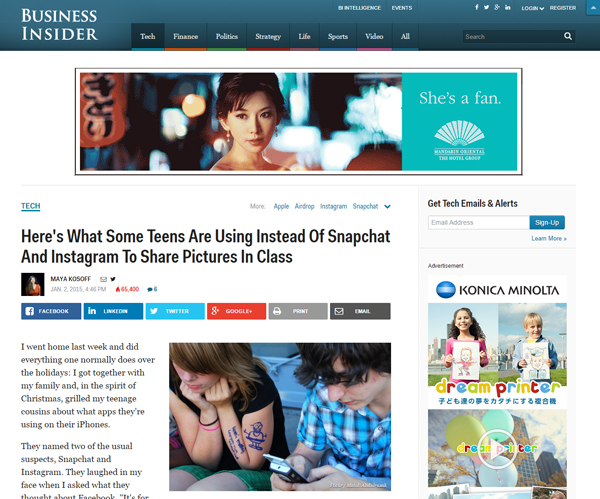 Instagramがいまだに急成長していること自体は疑いないが、2015年1月2日のネットメディアBusiness Insiderでは、米国のティーンエイジャーの気持ちはすでにInstagram(およびSnapchat)から離れつつあるという記事が掲載されていた(http://www.businessinsider.com/teens-using-apple-airdrop-instead-of-snapchat-and-instagram-2015-1)。