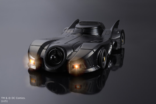 同製品は、バットモービルの造形とスマートフォンケースとしての持ちやすさを追求したiPhoneケース。劇中のマシンを精巧に再現しながらも、iPhone本来の操作性を確保している。本体後部の3つの灯による発光ギミックも搭載しており、暗闇で壁を照らすとバットシグナルが浮かび上がるほか、着信時はiPhoneのフラッシュライトでヘッドライトが発光する。