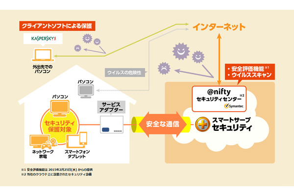 ソフトウェアの設定なしで利用できるセキュリティ機能を備えているため、これまでクライアントソフトをインストールできなかったスマート家電やゲーム機などの通信も保護できる。また、「@niftyセキュリティセンター」にて、サービスアダプターの配下に接続された機器が悪質なサイトに接続されることを防ぐ機能「安全評価機能」も2月25日から提供する。