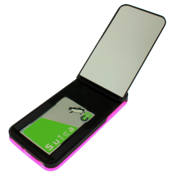 同製品は、ケースの裏を開けると、内蔵された大型のミラーを使うことができ、人と会う前の身だしなみチェックなどに役立てることができる。また、ミラーの反対側にはカード収納スロットがあり、取り出す機会の多いカードなどを入れておくことができる。例えば、交通系ICカードを入れていおて、駅の自動改札でケースに入れたままタッチ認識させることが可能。