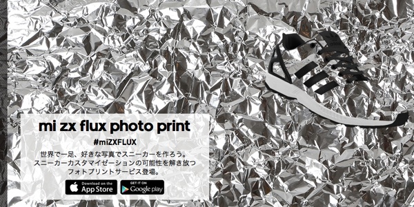 「mi ZX Flux Photo Print」は、App StoreまたはGoogle Playから無料でダウンロードした専用アプリで写真を撮影し保存した画像をスニーカー「ZX Flux」にレイアウトし、オリジナルのスニーカー作成できるというサービス。スニーカーの本体購入価格は1万6000円になる。
