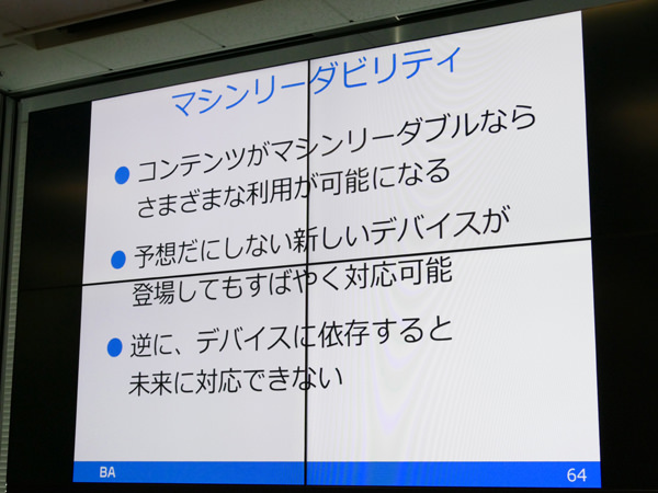 木達氏は、このような状況が待ち受ける中で、「Webコンテンツを空気や水のように流通させる必要性がある」と語った。スクリーンは多様化しており、スクリーンを持たないデバイスからのウェブアクセスも考える必要がある。Webはすでに「見た目だけ」の発想では対応できない時代に来ており、今後は“Webらしさ”という名の柔軟性が必要不可欠となる、その土台を担うのがマークアップによる情報伝達であり、マシンリーダビリティ/アクセシビリティこそが重要であると語った。