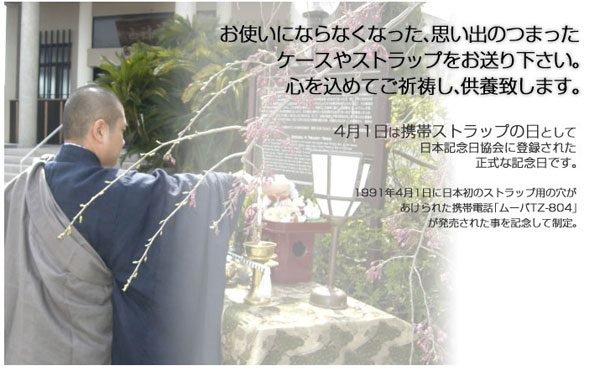 祈祷料は不要で、送料のみ負担で、供養したいスマホアクセサリーや携帯ストラップを同社まで送り、2015年4月1日(水)「携帯ストラップの日」に神奈川県小田原市にある徳常院にて供養を行うとのこと。