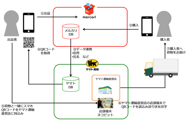 購入成立後はメルカリからQRコードをメルカリのアプリ上で出品者に発行する。ヤマト運輸直営店に出品者が配送商品を持ちこみ、QRコードを店頭端末「ネコピット」で読み取ることで送り状を印字できる。商品が購入者に届き、出品者と購入者が相互評価を行った後、販売金から販売手数料と送料が差し引かれ、出品者のアカウントに入金される。