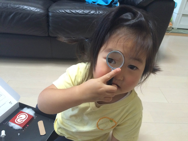 まずはリアルズームツールをチェック。意図を理解していないせいか、直接ズームツールを目に当ててしまう。本来のズームツールでは拡大表示することができるが、3歳児が使用すると全く使い方を誤るということが改めてわかった。