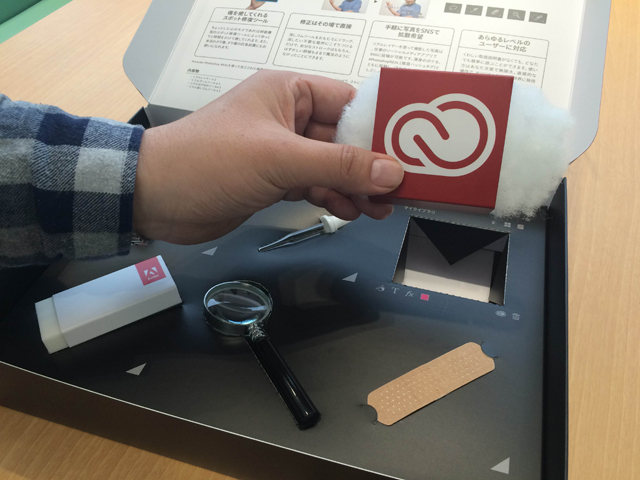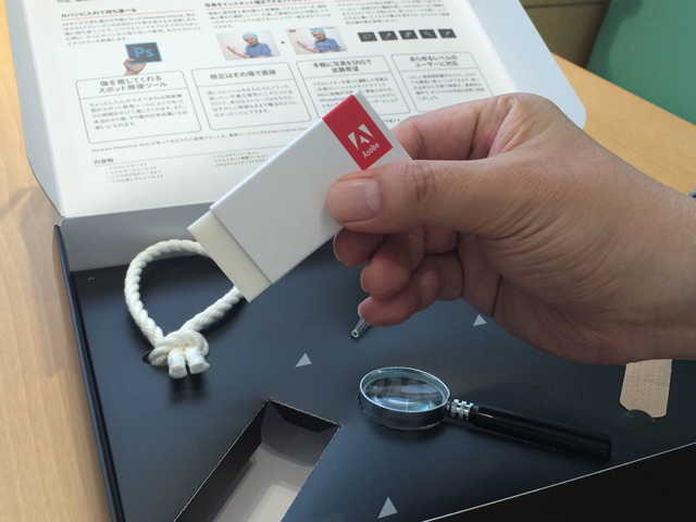 そして、次に取り出したのはリアル消しゴムツール。長時間のレビューに段々と飽きてきた頃なので、勝手にお絵かきをはじめる。仕事で使う資料にマジックで落書きした後、リアル消しゴムツールで消そうとしてみたが、油性ペンであったため、敢え無く撃沈。こちらはオンライン編集ツールの消しゴムツールの方に軍配があがった。ちなみにリアル消しゴムツールにあるロゴをよく見ると「Adobe」ではなく「Asobe」になっていた。こんなところにも遊び心を取り入れている。
