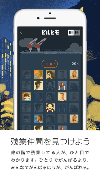 今まで同じビルにいて、なんとなく気になっていた人と知り合いになったり、自らが主催者となってワーカーが集う「ビル会」を開催したり、利用方法はさまざま。残業仲間を見つけて声を掛け合い、一緒にがんばるのも良いですね。新しいコミュニケーション・ツールとして面白いアプリです。
