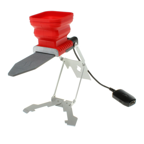 使い方はまず、本体上部の赤いシリコンカップに水を注ぐ。その後、黒いブレード状の金属板を過熱すれば準備完了となる。過熱する金属板と水の入ったシリコンカップの温度差で、発電する仕組みだ。熱源はキャンプバーナーなど地面に固定して火を起こせるものが最適としている。たき火や非常用のキャンドルでも発電できるが、金属板に触れたり火に近づきないよう十分に注意する必要がある。