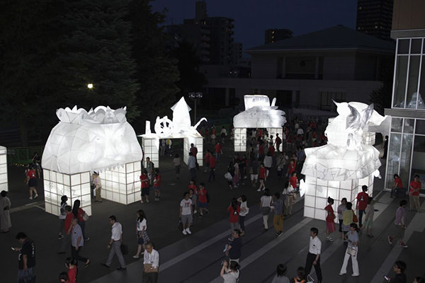 学生たちは、これまで春学期の「ワークショップ」科目の中で、ねぶたの歴史、文字表現と造形の融合、グループマネジメント、製作する「ねぷた」のデザイン検討/模型作成、ねぷた製作技術の習得など、多くのことを学んできた。当日は、それらの集大成として、造形や使用する和紙の濃淡によって美しく輝く光のアートがキャンパスに出現する。