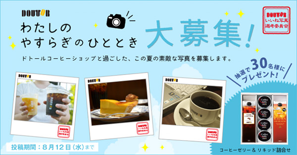 株式会社ドトールコーヒーは、2015年7月22日(水)より「わたしのやすらぎのひととき」の写真投稿を募集するキャンペーンを開始した。応募受付の期間は2015年8月12日(水)まで。ドトールコーヒーショップでのくつろぎのシーンや、お気に入りのメニューの写真などを同キャンペーンの専用Webサイトから投稿すると、キャンペーン事務局の厳選により30名の当選者が決定し、「コーヒーゼリー&リキッド詰め合わせ」がプレゼントされる。