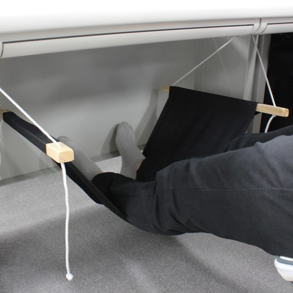 同製品は、デスクの下に簡単に取り付けられる足用ハンモック。フットレスト風に足を乗せてリラックスできるほか、モノ置きとしても使用可能で、上着やカバン、靴などを置くことができる。ハンモックが耐えられる重量は約45kgまで。