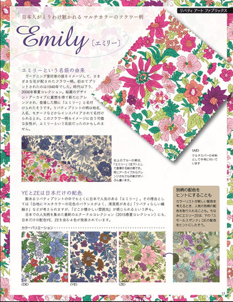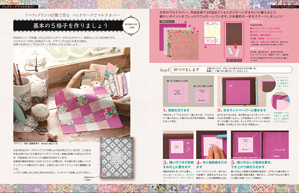 なお、リバティプリントには、フラワー柄/草花モチーフ柄/ペイズリー・更紗/幾何学・幾何花など多様な柄があり、本シリーズに付属する生地は65号を通して計70種類以上にも及ぶ。収録されている記事は、暮らしの雑貨ソーイング/パッチワークでマルチカバー/リバティアートファブリックスと3つの章による構成だ。このうちリバティアートファブリックスでは、リバティプリントにおける人気のデザインについて解説。芸術性が高いデザインの成り立ちやエピソードが、色バリエーションとともに紹介されている。