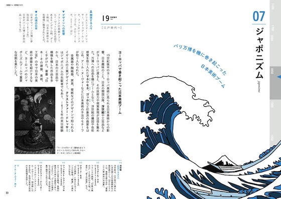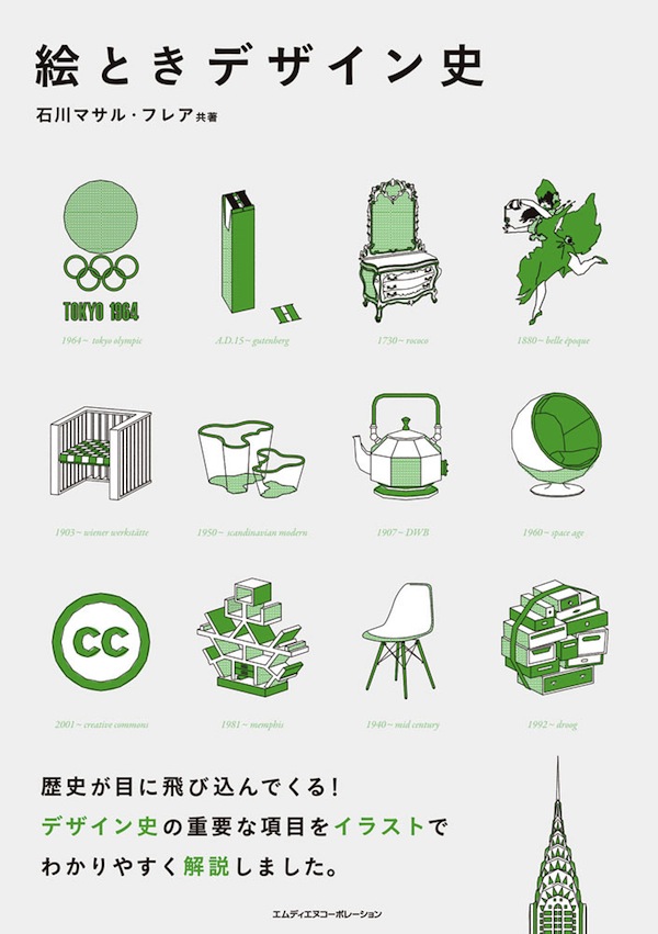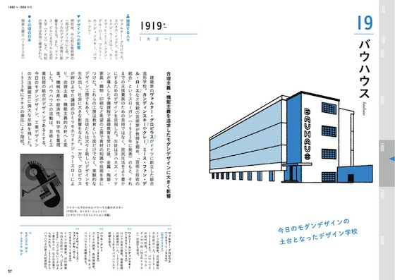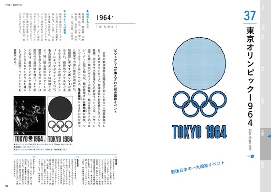 歴史と聞くと、どこかお勉強的で文字がたくさん……という印象も無きにしも非ずだが、本書はそんな今までの常識を覆す、特徴的なイラストを効かせることですんなりとアタマに入ってくる手法を取っている。重厚な感じはまったくなく、それぞれのデザインの歴史をあらゆる層の読者に分かりやすく、やんわりと印象づける。話題の1964年東京オリンピックのデザインのほか、グラフィック、プロダクト、工業デザイン、美術、運動、音楽、サブカルチャー……知っておきたい重要項目を幅広くカバーする。
