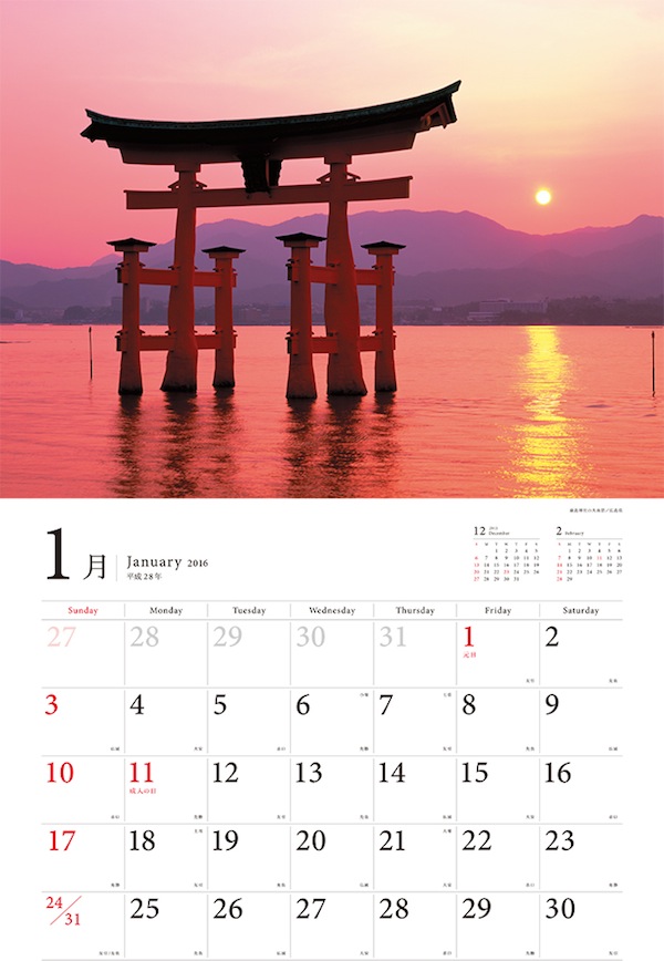 空気感、色付き、天候など、自然状況は一度として同じ状況はなく、刻々と変化を遂げるもの。誰もが知る「これぞ日本」といえる日本のメジャーなスポットを厳選し、美しい四季の風景、それも最高の瞬間を海外の写真家達が撮影した渾身のカレンダー。朝日に照らされる厳島神社の大鳥居や、異国情緒あふれる熊本県のラピュタの道、燃えるような見事な紅葉に心奪われる鳴子峡など、有名なところばかりを掲載している。まさに四季を追いながら、鮮明な色やその場所の空気を感じ取れるカレンダーとなっている。